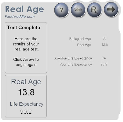 LOL! estou parva! acabei de fazer o teste, e a minha idade real é apenas menos dois anos que a minha idade biológica! (pronto... a parte do stress, das horas de sono e do intestino deu-me cabo da média!:)) mas como é que tu chegaste aos 13 anos?!?!? dormes 15 horas, nunca te sentes stressado, tens o colesterol a 0, és happilly married, comes fruta e vegetais e nunca vais à bola? tens a certeza que não tens MESMO 13 anos?:)